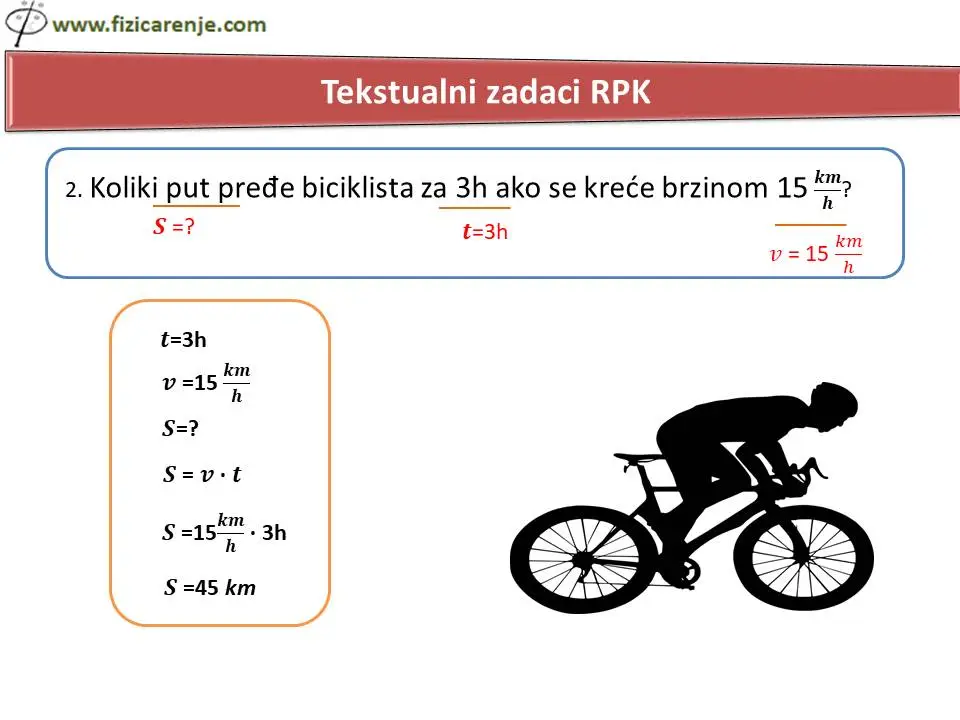 2. Koliki put pređe biciklista za 3h ako se kreće brzinom 15 km/h?
