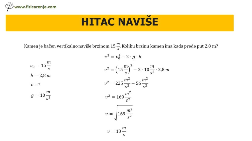 Kamen je bačen vertikalno naviše brzinom 15 m/s. Koliku brzinu kamen ima kada pređe put 2,8 m?
