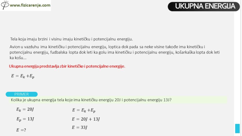 Kolika je ukupna energija tela koje ima kinetičku energiju 20 J i potencijalnu energiju 13 J?