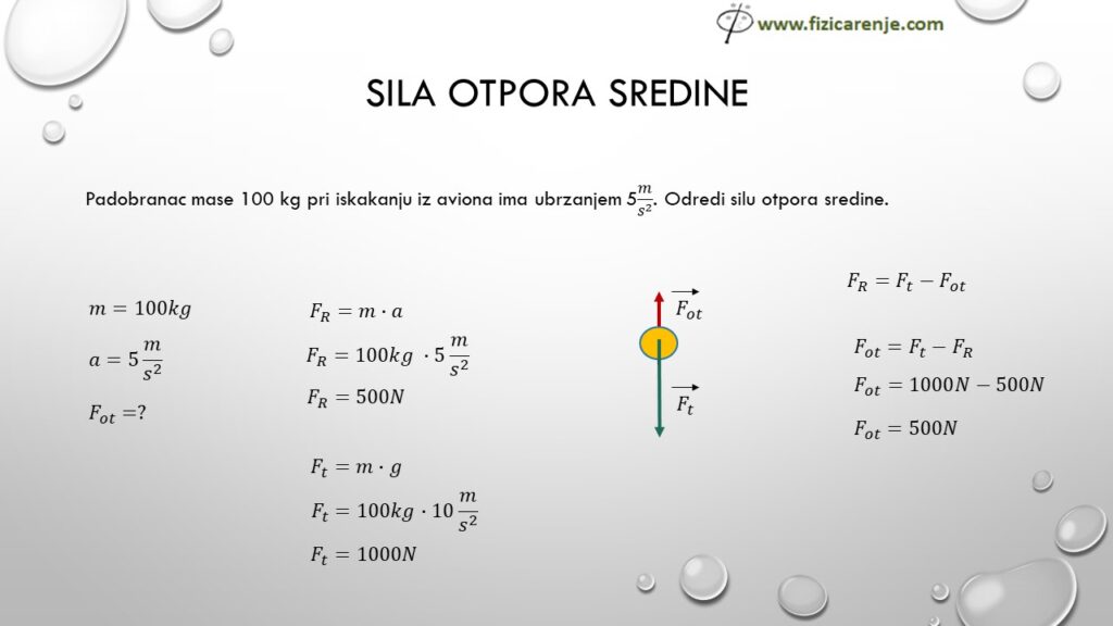 Padobranac mase 100 kg pri iskakanju iz aviona ima ubrzanjem 5𝑚/𝑠². Odredi silu otpora sredine.