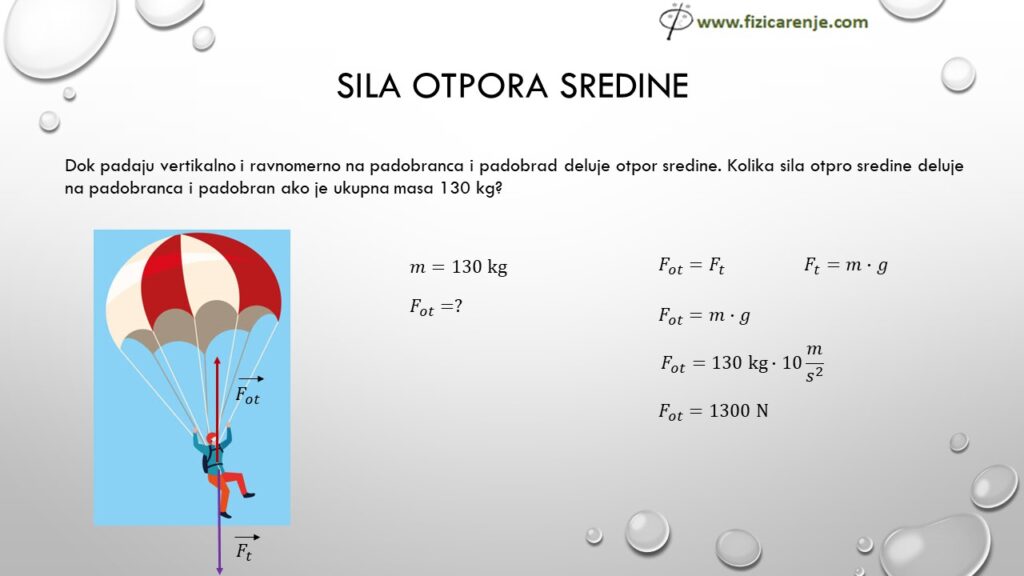 Dok padaju vertikalno i ravnomerno na padobranca i padobran deluje otpor sredine. Kolika sila otpora sredine deluje na padobranca i padobran ako je ukupna masa 130 kg?