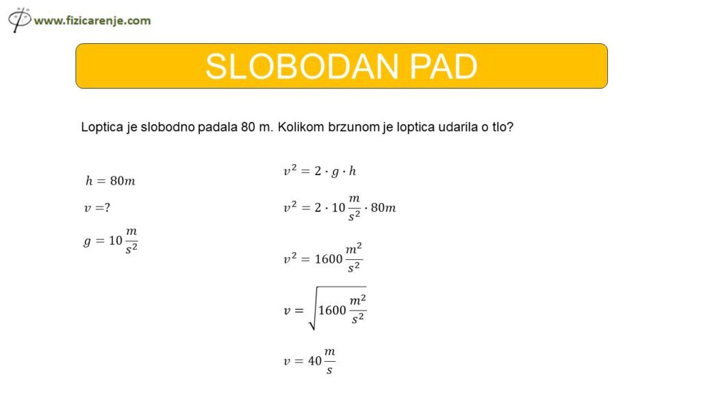 Loptica je slobodno padala 80 m. Kolikom brzinom je loptica udarila o tlo?