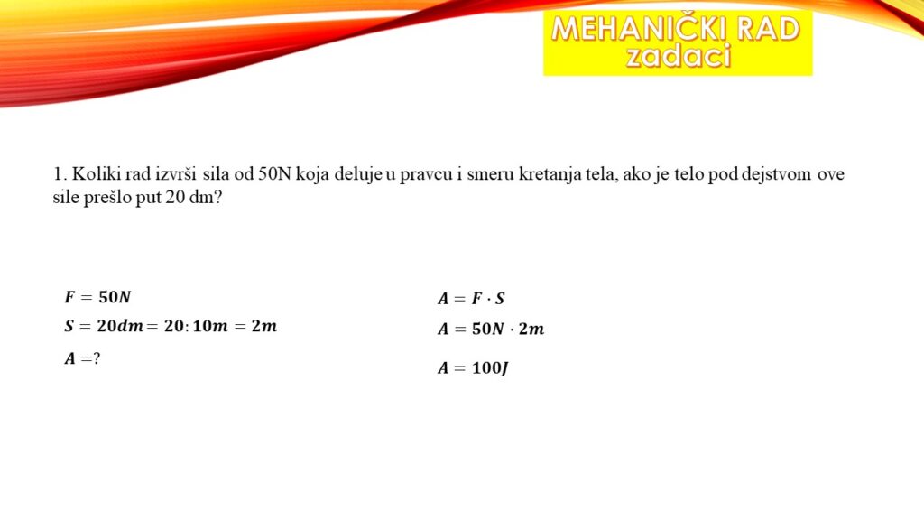 1. Koliki rad izvrši sila od 50 N koja deluje u pravcu i smeru kretanja tela, ako je telo pod dejstvom ove sile prešlo put 20 dm?