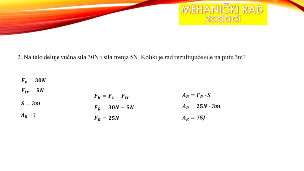 2. Na telo deluje vučna sila 30 N i sila trenja 5 N. Koliki je rad rezultujuće sile na putu 3 m?
