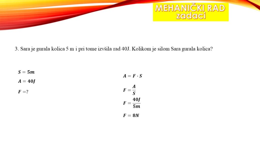3. Sara je gurala kolica 5 m i pri tome izvršila rad 40 J. Kolikom je silom Sara gurala kolica?