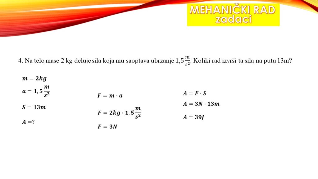 4. Na telo mase 2 kg deluje sila koja mu saopštava ubrzanje 1,5 𝑚/𝑠2. Koliki rad izvrši ta sila na putu 13 m?