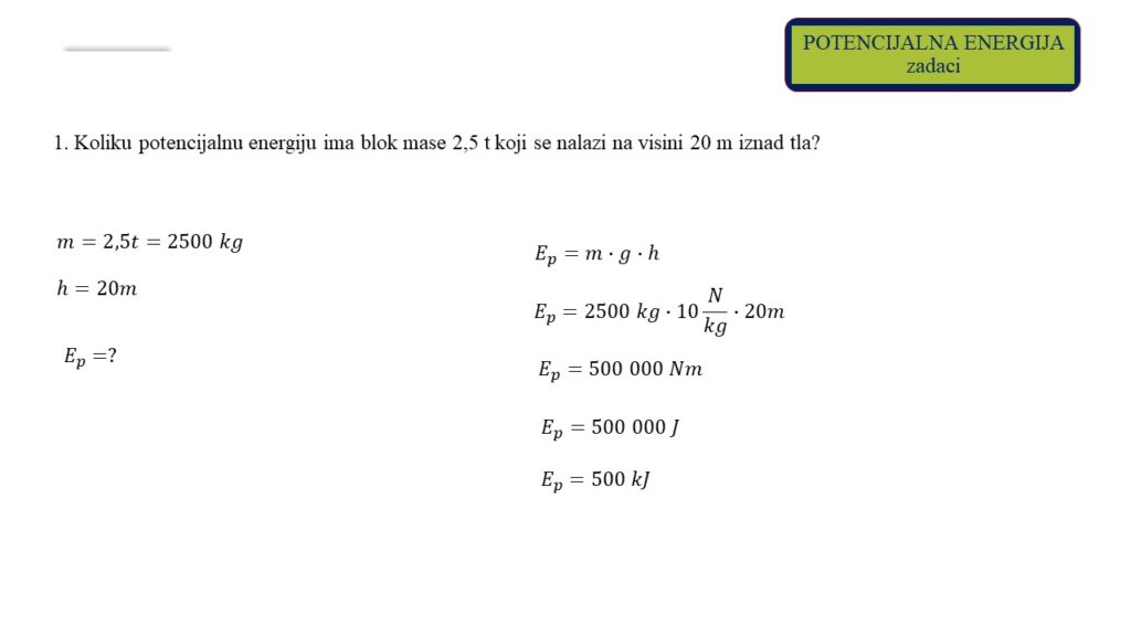 1. Koliku potencijalnu energiju ima blok mase 2,5 t koji se nalazi na visini 20 m iznad tla?