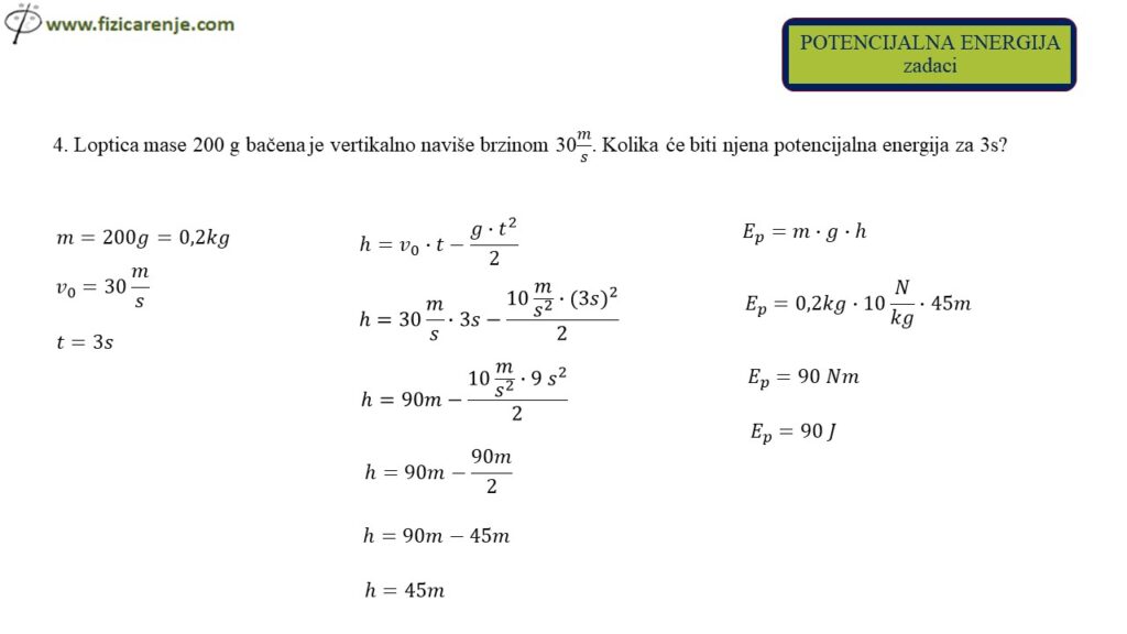 4. Loptica mase 200 g bačena je vertikalno naviše brzinom 30 𝑚/𝑠 . Kolika će biti njena potencijalna energija za 3 s?