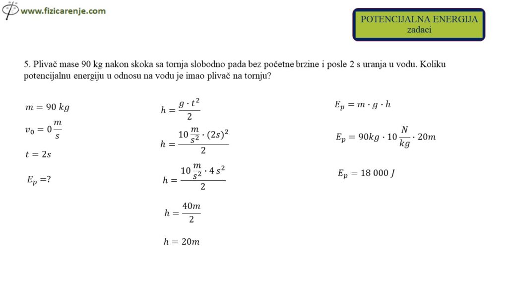 5. Plivač mase 90 kg nakon skoka sa tornja slobodno pada bez početne brzine i posle 2 s uranja u vodu. Koliku potencijalnu energiju u odnosu na vodu je imao plivač na tornju?