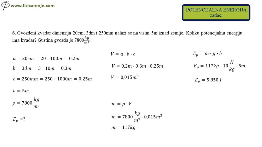 6. Gvozdeni kvadar dimenzija 20 cm, 3 dm i 250 mm nalazi se na visini 5m iznad zemlje. Koliku potencijalnu energiju ima kvadar? Gustina gvožđa je 7800 𝑘𝑔/𝑚3.
