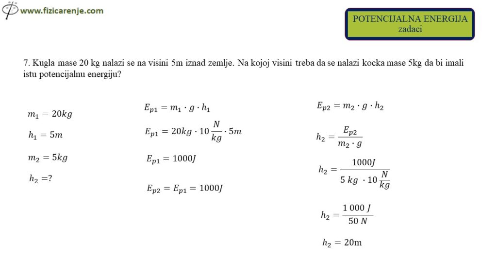 7. Kugla mase 20 kg nalazi se na visini 5 m iznad zemlje. Na kojoj visini treba da se nalazi kocka mase 5 kg da bi imale istu potencijalnu energiju?