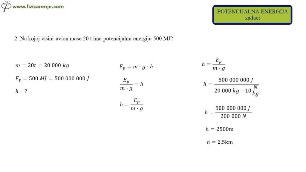 2. Na kojoj visini avion mase 20 t ima potencijalnu energiju 500 MJ?