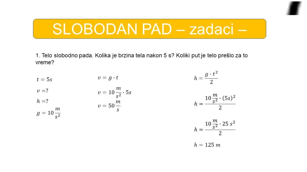 1. Telo slobodno pada. Kolika je brzina tela nakon 5 s? Koliki put je telo prešlo za to vreme?