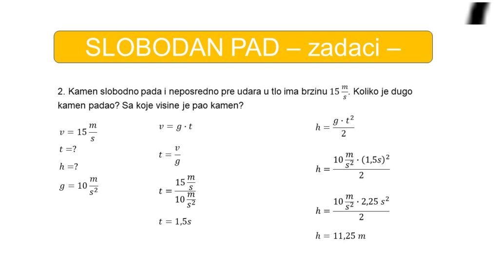 2. Kamen slobodno pada i neposredno pre udara u tlo ima brzinu 15 m/s. Koliko je dugo kamen padao? Sa koje visine je pao kamen?