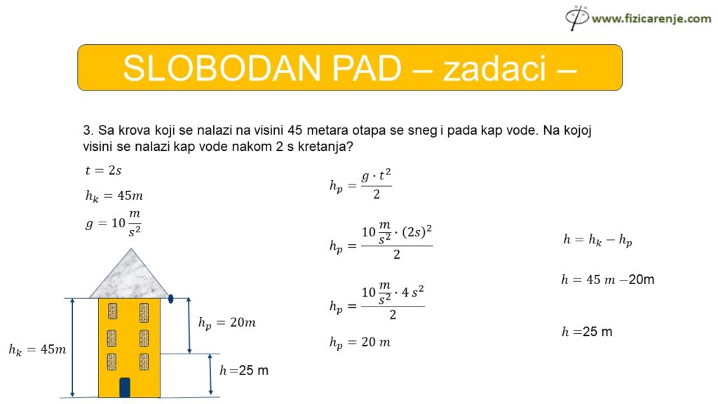 3. Sa krova koji se nalazi na visini 45 metara otapa se sneg i pada kap vode. Na kojoj visini se nalazi kap vode nakon 2 s kretanja?