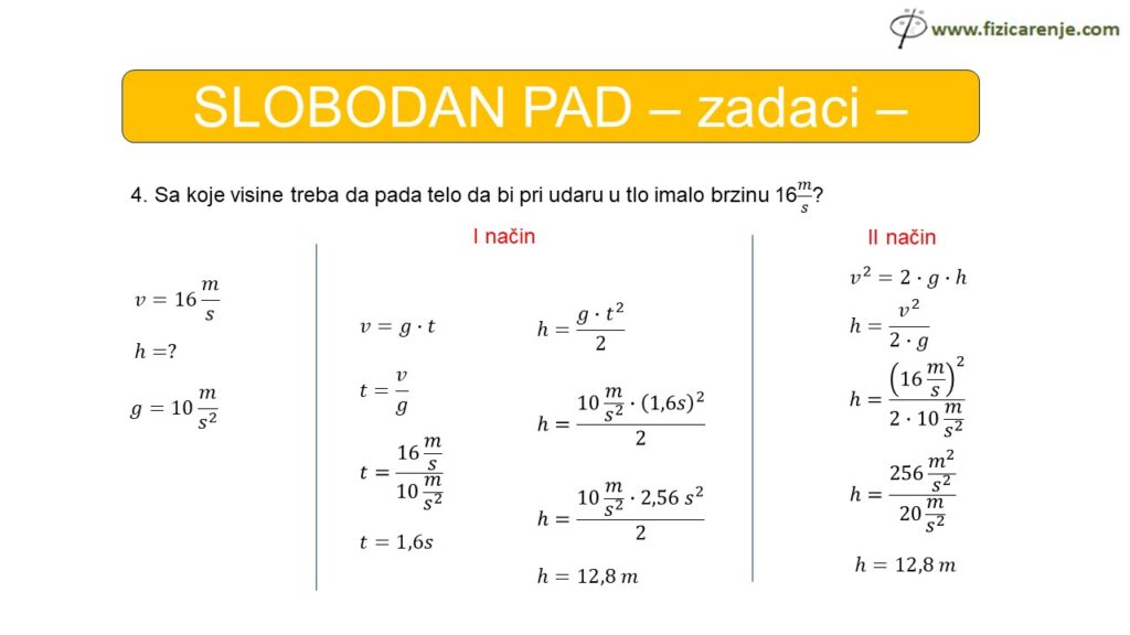 4. Sa koje visine treba da pada telo da bi pri udaru u tlo imalo brzinu 16m/s?