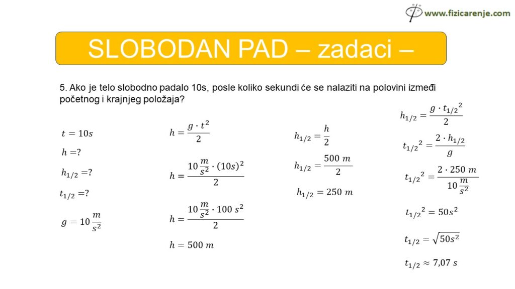 5. Ako je telo slobodno padalo 10s, posle koliko sekundi će se nalaziti na polovini između početnog i krajnjeg položaja?