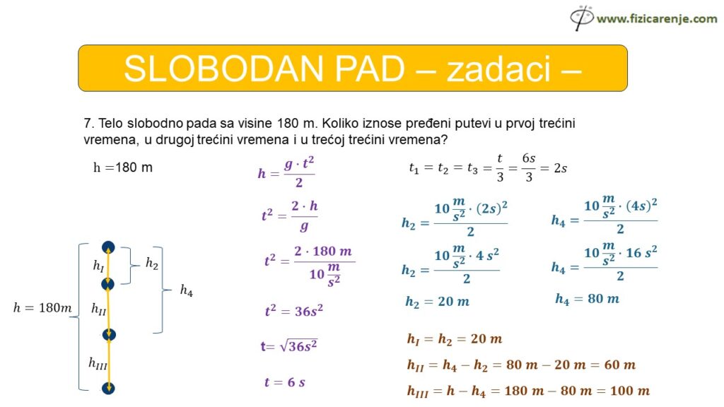 7. Telo slobodno pada sa visine 180 m. Koliko iznose pređeni putevi u prvoj trećini vremena, u drugoj trećini vremena i u trećoj trećini vremena?