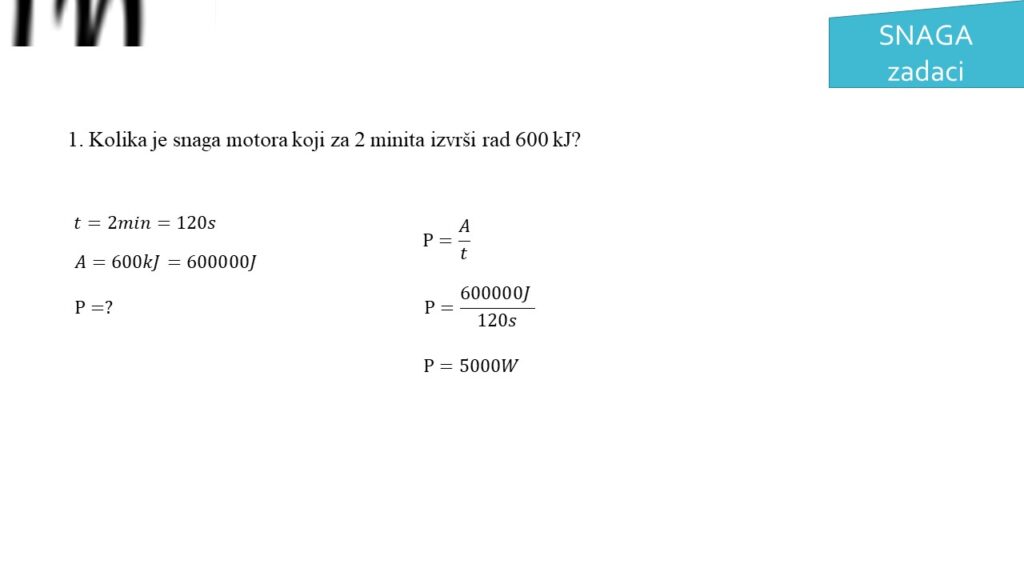 1. Kolika je snaga motora koji za 2 minuta izvrši rad 600 kJ?
