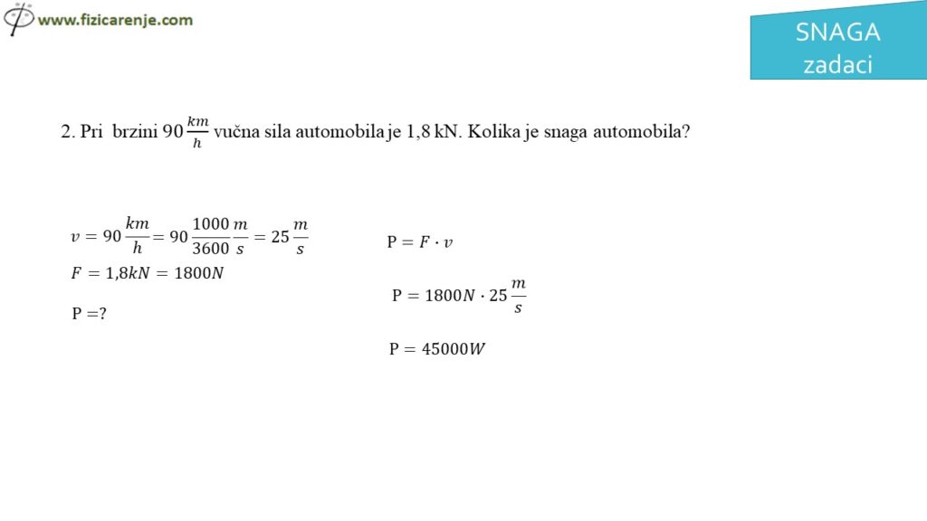 2. Pri brzini 90 𝑘𝑚/ℎ vučna sila automobila je 1,8 kN. Kolika je snaga automobila?