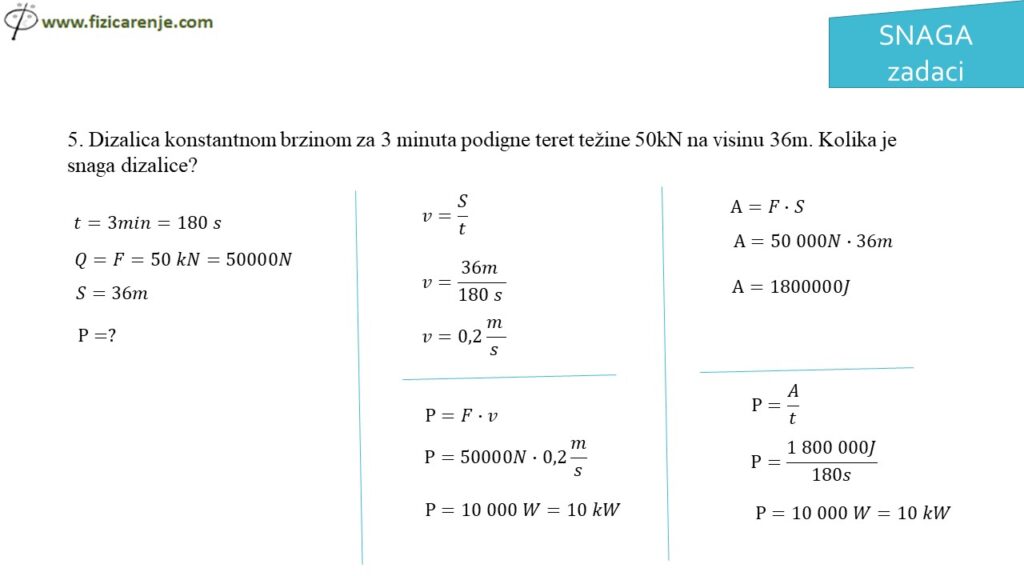 5. Dizalica konstantnom brzinom za 3 minute podigne teret težine 50 kN na visinu 36 m. Kolika je snaga dizalice?