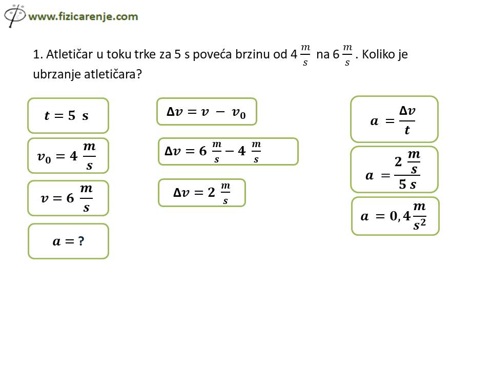 1. Atletičar u toku trke za 5 s poveća brzinu od 4 m/s na 6 m/s . Koliko je ubrzanje atletičara?