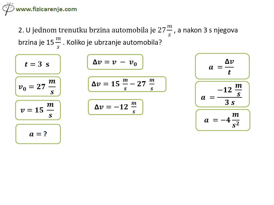 2. U jednom trenutku brzina automobila je 27 m/s , a nakon 3 s njegova brzina je 15 m/s. Koliko je ubrzanje automobila?