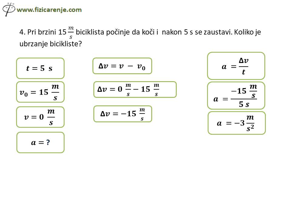 4. Pri brzini 15 m/s biciklista počinje da koči i nakon 5 s se zaustavi. Koliko je ubrzanje bicikliste?