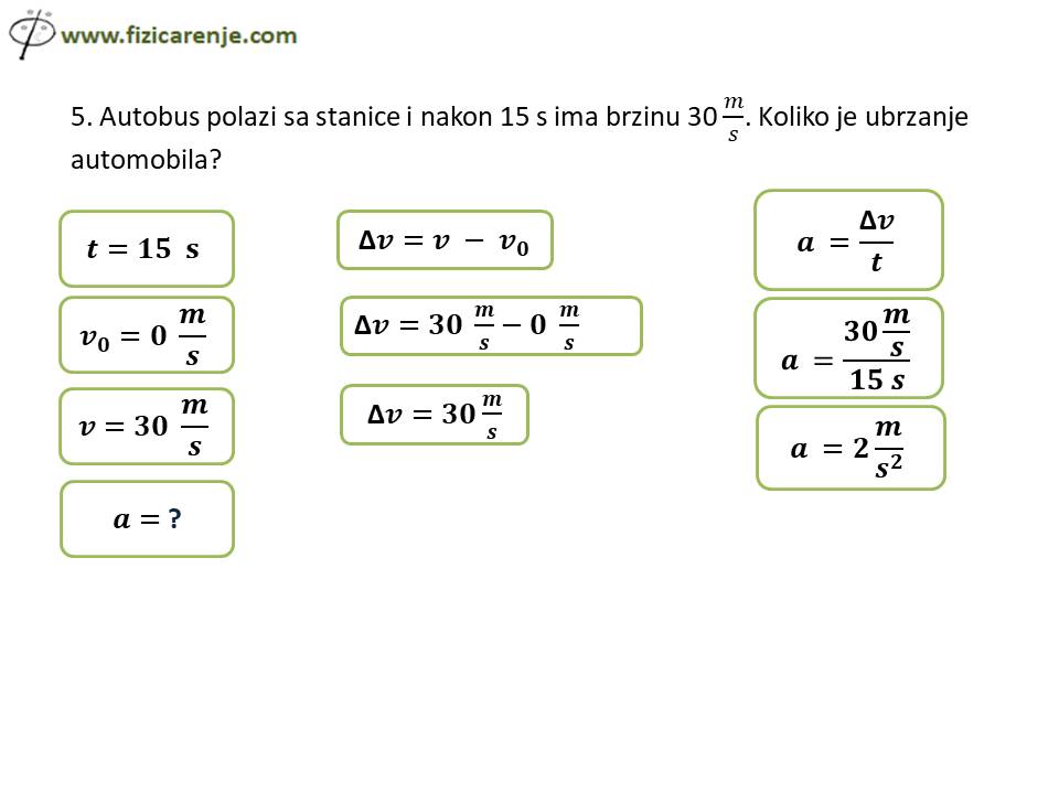 5. Autobus polazi sa stanice i nakon 15 s ima brzinu 30 m/s. Koliko je ubrzanje automobila?