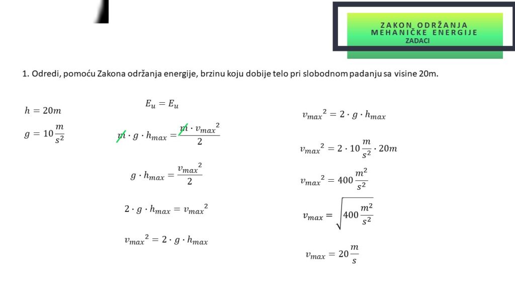 1. Odredi, pomoću Zakona održanja energije, brzinu koju dobije telo pri slobodnom padanju sa visine 20 m.