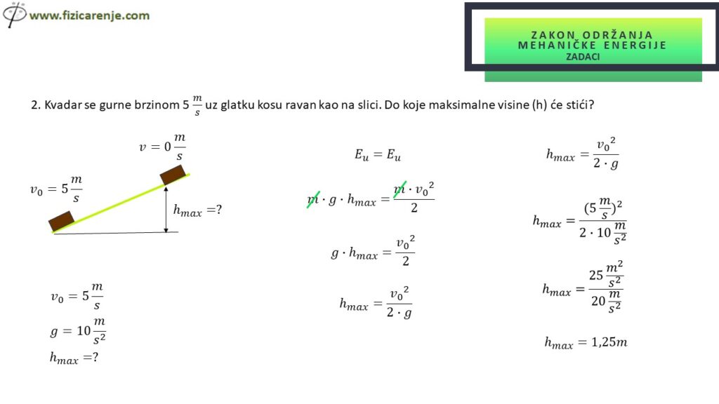 2. Kvadar se gurne brzinom 5 𝑚/𝑠 uz glatku kosu ravan kao na slici. Do koje maksimalne visine (h) će stići?