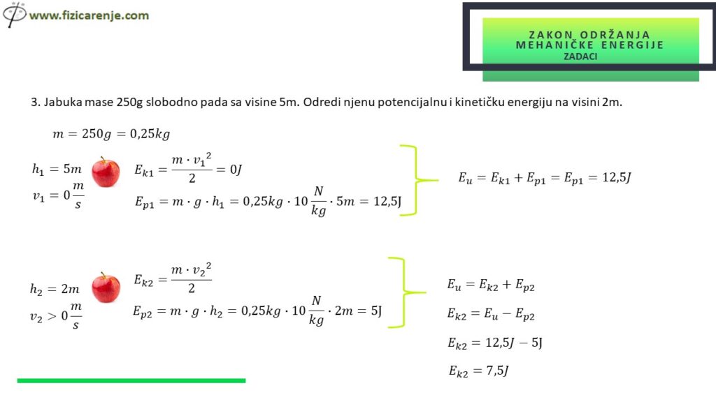 3. Jabuka mase 250 g slobodno pada sa visine 5 m. Odredi njenu potencijalnu i kinetičku energiju na visini 2m.