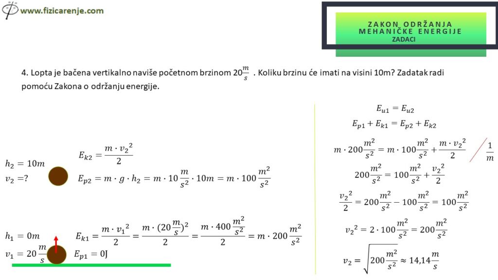 4. Lopta je bačena vertikalno naviše početnom brzinom 20 𝑚/𝑠 . Koliku brzinu će imati na visini 10m? Zadatak radi pomoću Zakona o održanju energije.