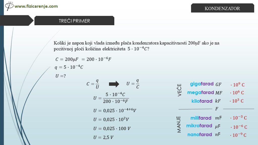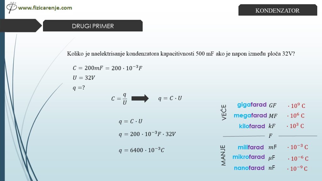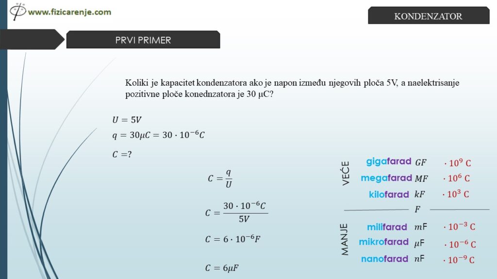 - Koji obrazac koristiš da izračunaš koliki je kapacitet, napon ili naelektrisanje kondenzatora.