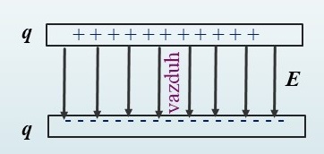 Električni kondenzator se crta kao dve paralelne ploče — jedna pozitivna, druga negativna, razdvojene izolatorom (dielektrikom).