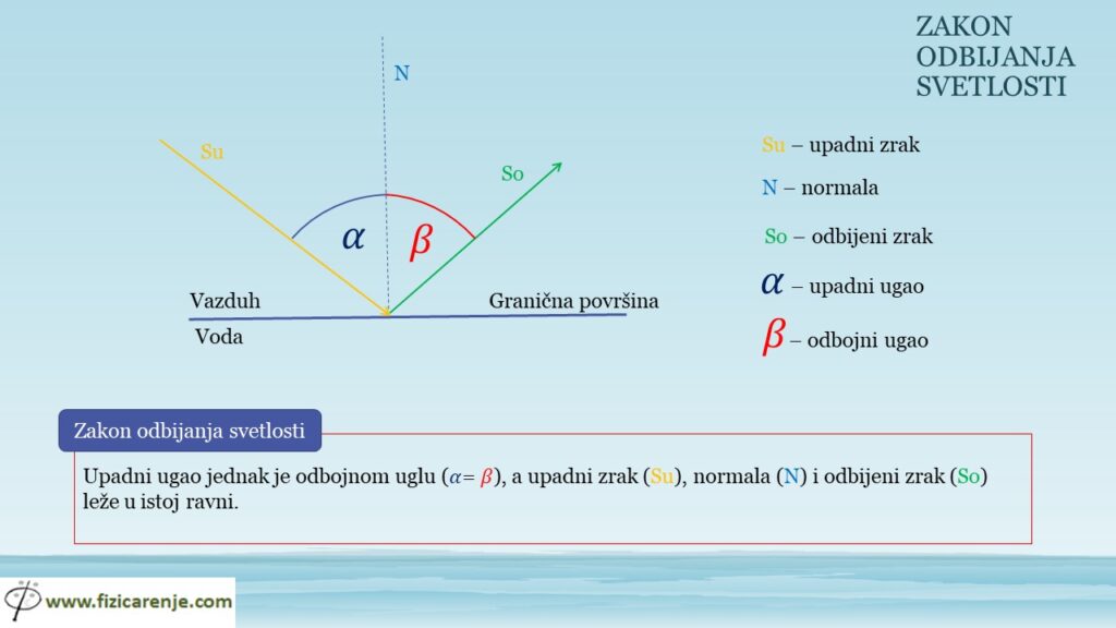 (Slika: linija granične površine, normala, upadni zrak i odbijeni zrak sa označenim uglovima)