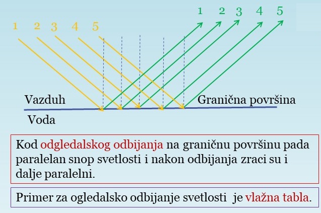 Ogledalsko odbijanje: vlažna tabla, ravno ogledalo, glatka vodena površina, polirani metal.