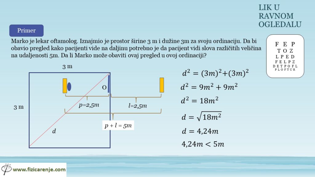 Marko je lekar oftalmolog. Iznajmio je prostor širine 3 m i dužine 3m za svoju ordinaciju. Da bi obavio pregled kako pacijenti vide na daljinu potrebno je da pacijent vidi slova različitih veličina na udaljenosti 5m. Da li Marko može obaviti ovaj pregled u ovoj ordinaciji?