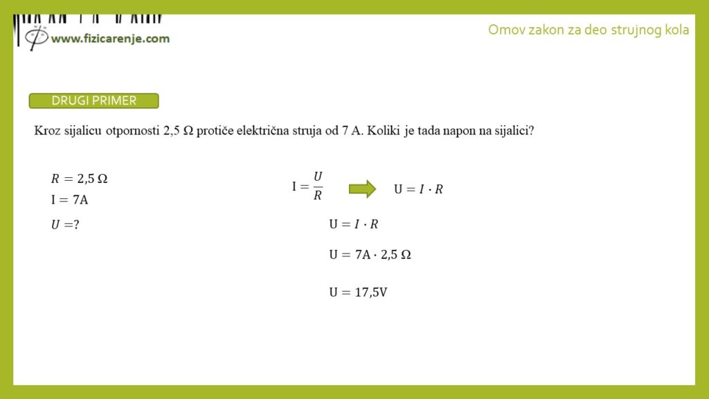 2. Kroz sijalicu otpornosti 2,5 Ω protiče električna struja od 7 A. Koliki je tada napon na sijalici?