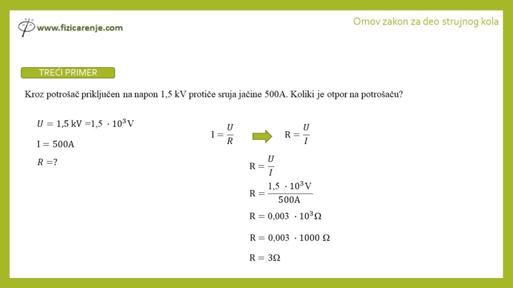 3. Kroz potrošač priključen na napon 1,5 kV protiče struja jačine 500 A. Koliki je otpor na potrošaču?