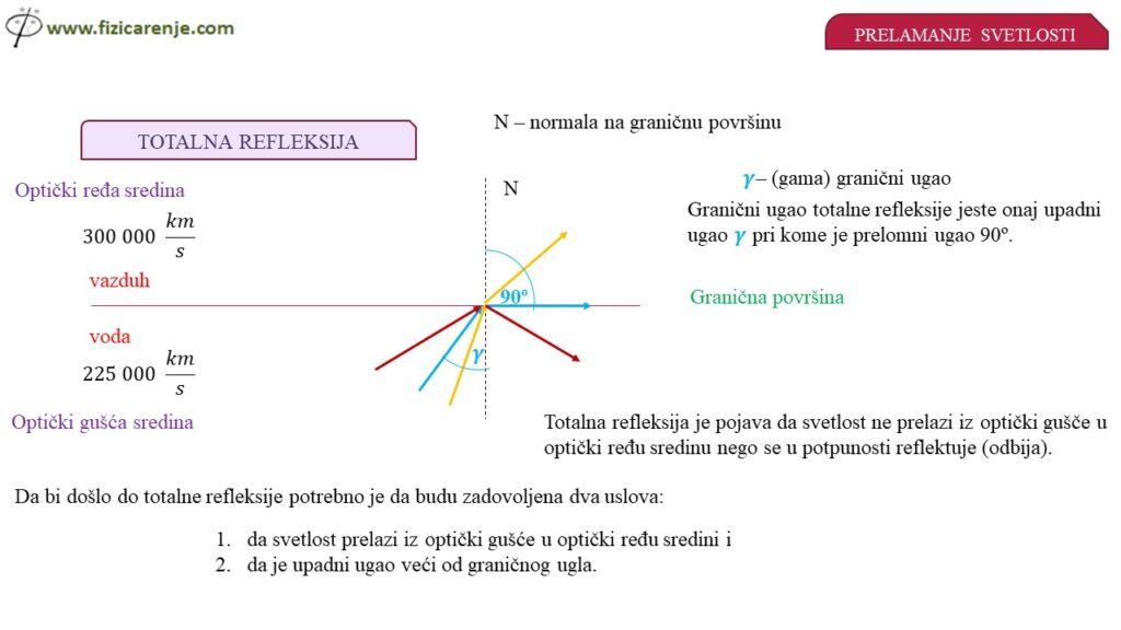- Svetlost mora prelaziti iz optički gušće u optički ređu sredinu.