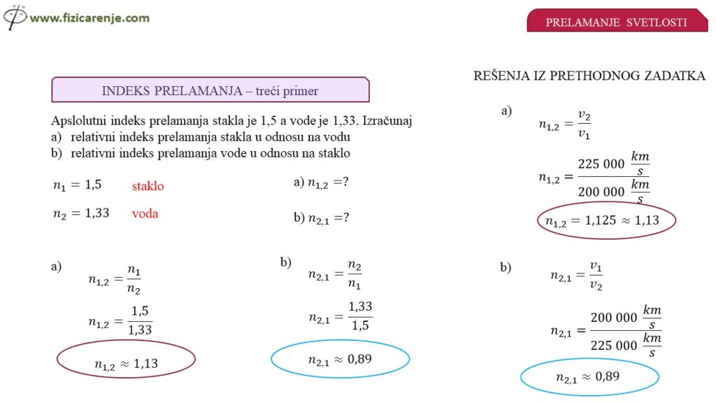 Gde su v1 i v2 brzine svetlosti u neki sredinama, a n1 i n2 apsolutni indeksi prleamanja tih sredina.