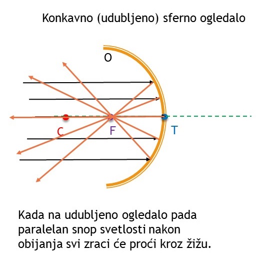 (Slika: paralelni zraci dolaze ka ogledalu i nakon odbijanja seku se u žiži F)