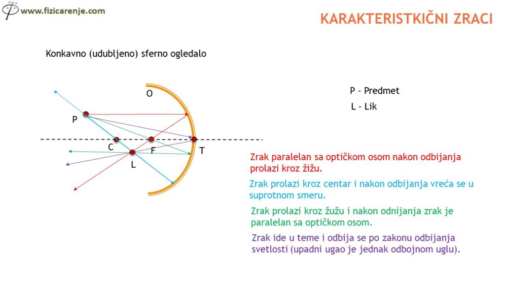 5. Karakteristični zraci kod konkavnog ogledala. (Nacrtaj sliku i objasni.)