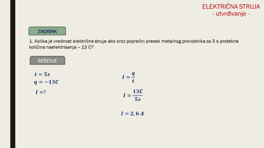 1. Kolika je vrednost električne struje ako kroz poprečni presek metalnog provodnika za 5 s protekne količina naelektrisanja – 13 C?