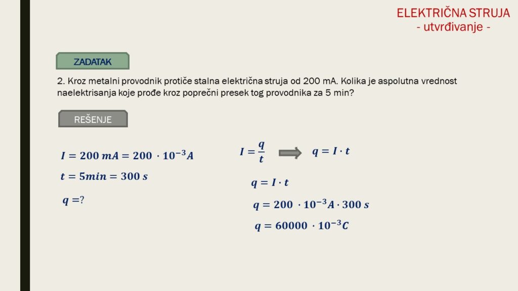 2. Kroz metalni provodnik protiče stalna električna struja od 200 mA. Kolika je apsolutna vrednost naelektrisanja koje prođe kroz poprečni presek tog provodnika za 5 min?