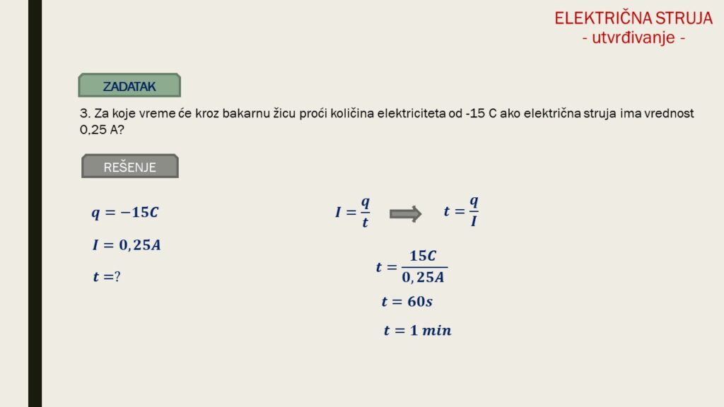 3. Za koje vreme će kroz bakarnu žicu proći količina elektriciteta od -15 C ako električna struja ima vrednost 0,25 A?