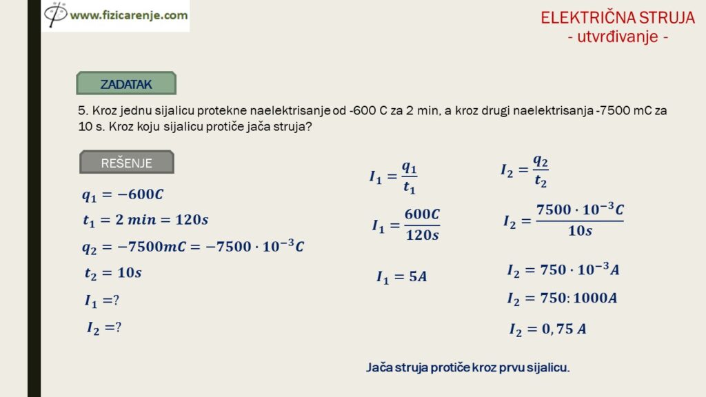 5. Kroz jednu sijalicu protekne naelektrisanje od -600 C za 2 min, a kroz drugu naelektrisanje -7500 mC za 10 s. Kroz koju sijalicu protiče jača struja?