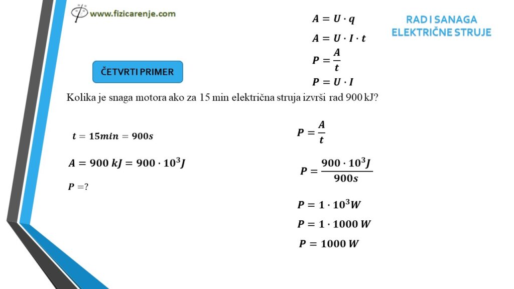 Kolika je snaga motora ako za 15 min električna struja izvrši rad 900 kJ?