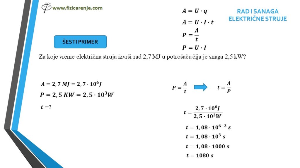 Za koje vreme električna struja izvrši rad 2,7 MJ u potrošaču čija je snaga 2,5 kW?